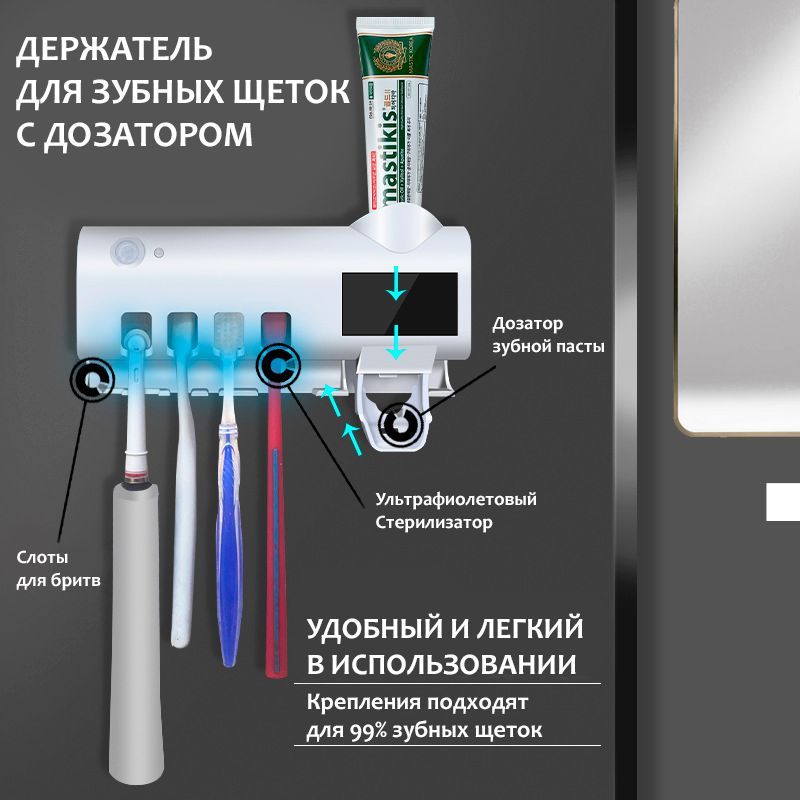 Данный держатель подходит для четырех обычных зубных щеток и одной липзедрической, а также места для зубной пасты.