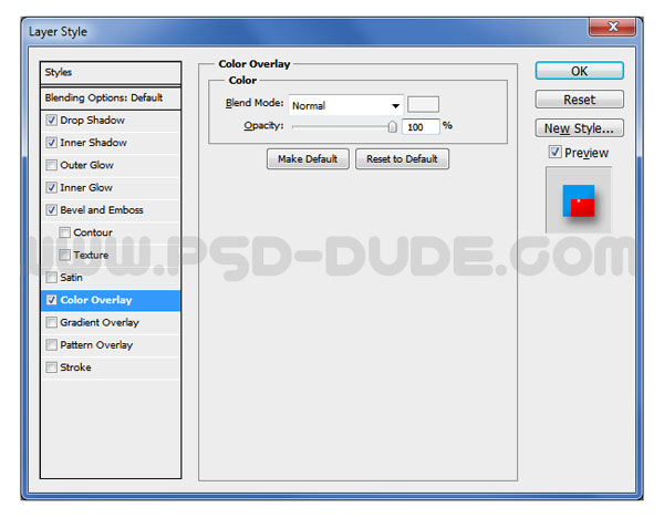 Примените визуальное оформление для слоя посредством функции Наложение цвета (Color Overlay). Установите следующие параметры: